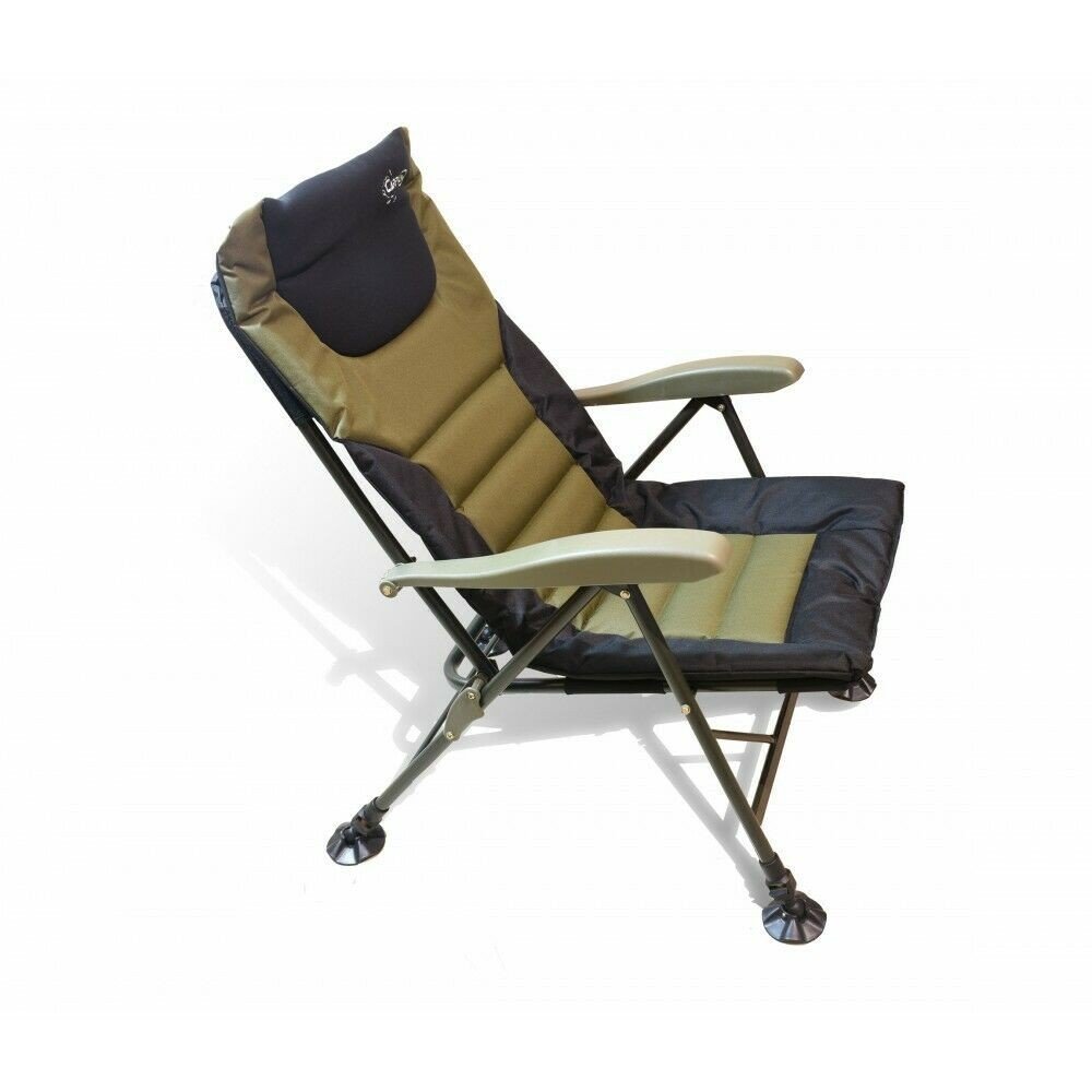 Bequemer Karpfenstuhl mit verstellbarer Rückenlehne und gepolerten Armlehnen. Ideal für lange Angelausflüge – robust und faltbar.
