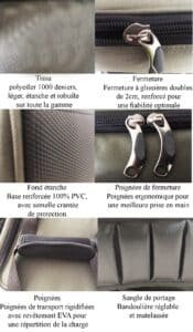 Er verfügt über drei Außentaschen (eine vorne, zwei seitlich), einen verstärkten EVA-Tragegriff, einen abnehmbaren gepolsterten Schultergurt und einen wasserdichten Hartboden.