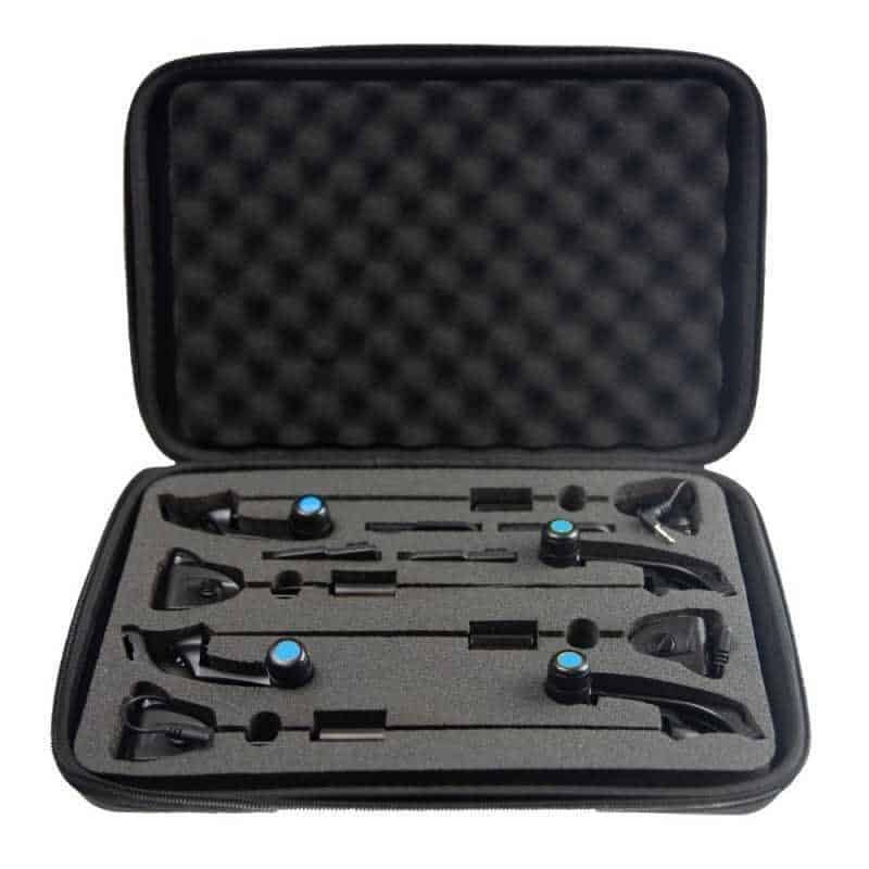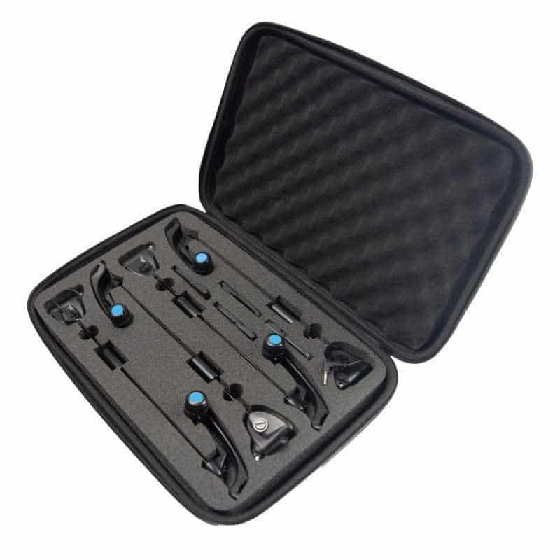 4 blaue LED-Hanger mit 2,5 mm Klinkenanschluss, Edelstahlgewicht, flexibler Kette und Transportbox – ideal für präzise Bissanzeige bei Nacht.