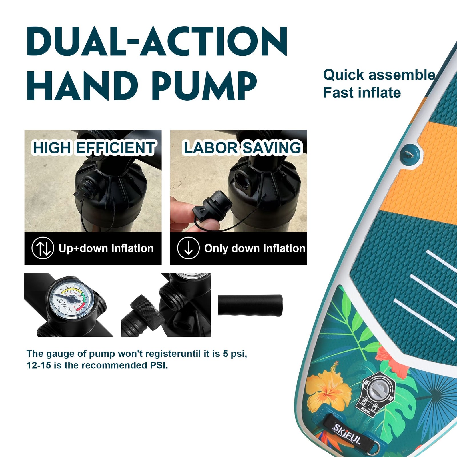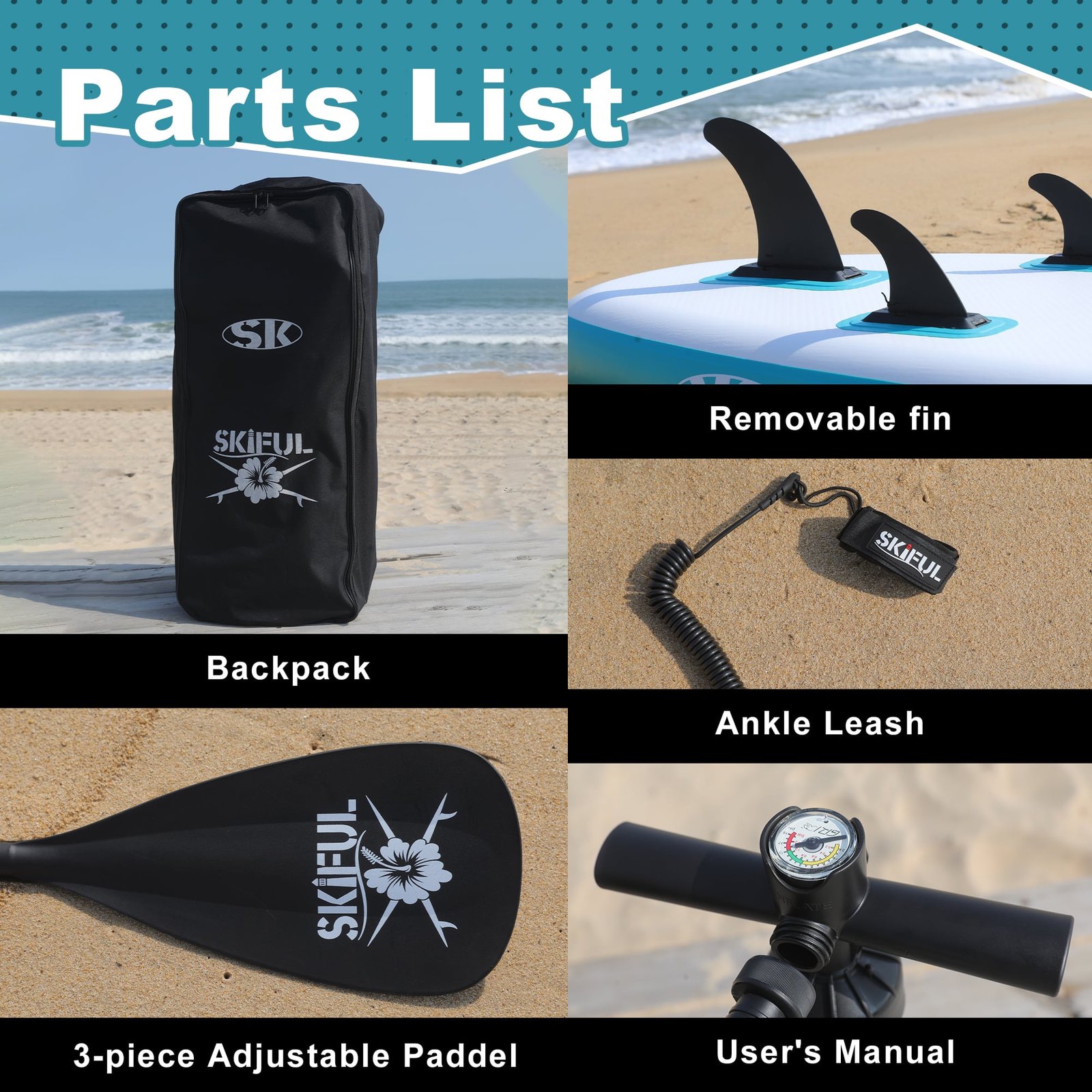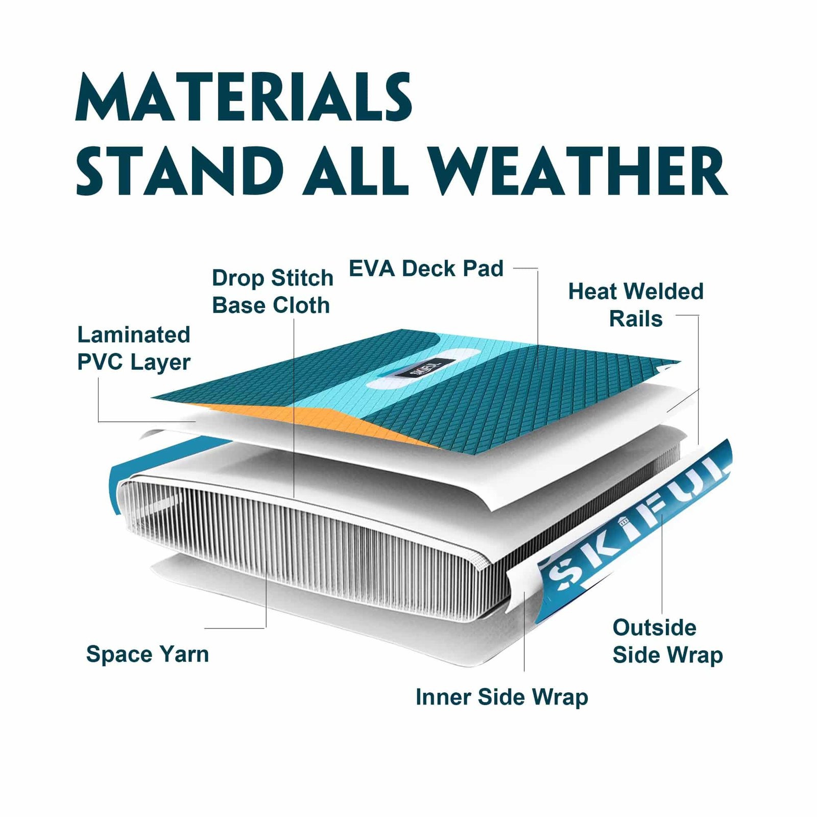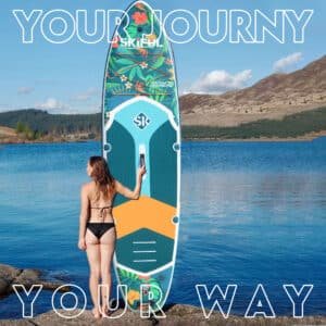 Das SKIFUL SUP Board besteht aus doppelt verstärktem Gewebe, 0,9 mm PVC-Komposit und einer rutschfesten EVA-Trittfläche – robust, langlebig und ideal für Einsteiger wie Fortgeschrittene. Dank des Doppelkammer-Designs bleibt das Board auch bei Teildefekt funktionstüchtig und bietet maximale Sicherheit auf dem Wasser.
