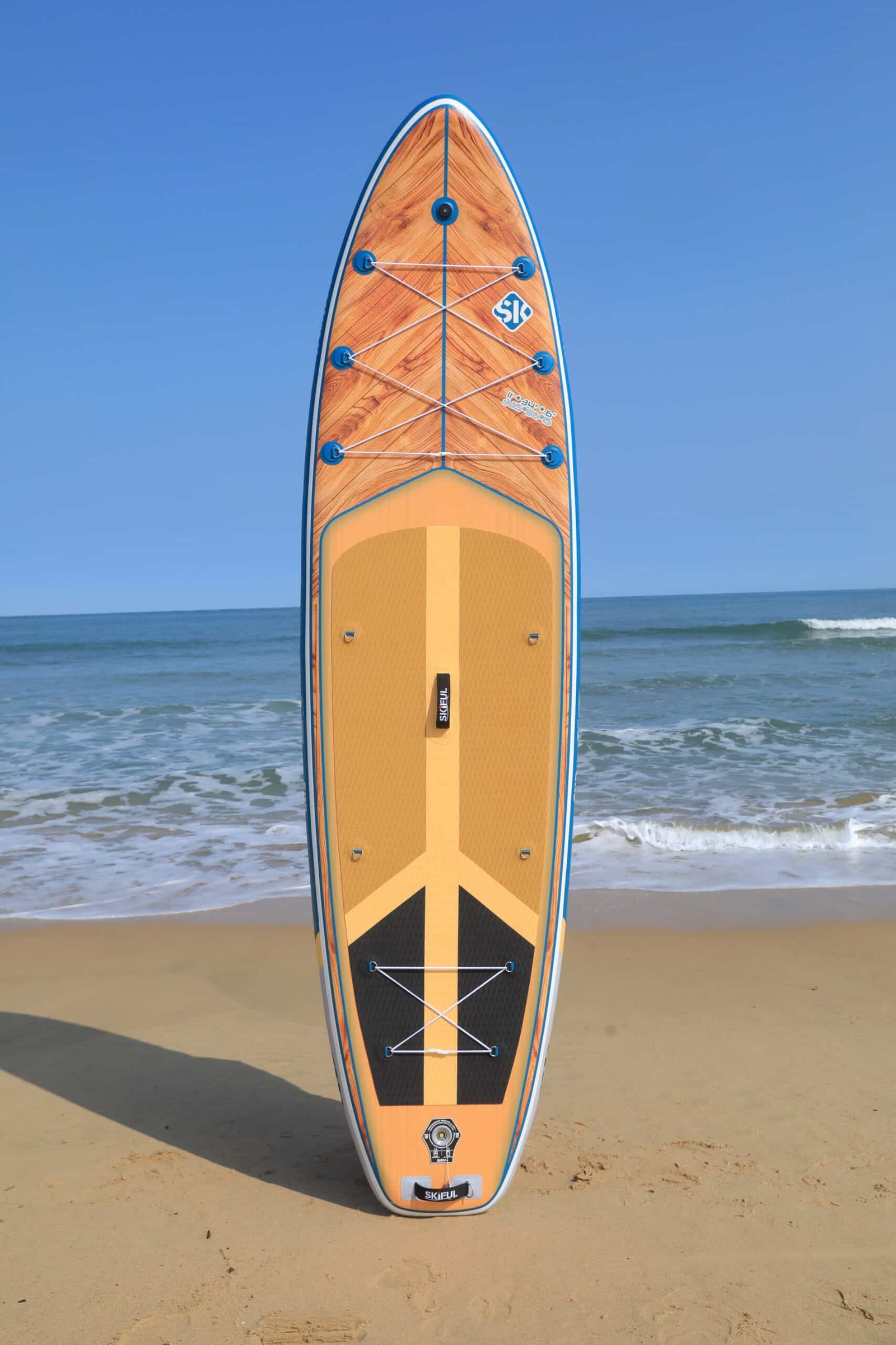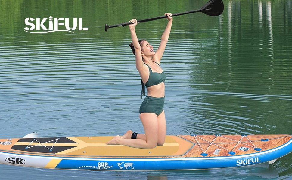Das SKIFUL SUP Board besteht aus doppelt verstärktem Gewebe, 0,9 mm PVC-Komposit und einer rutschfesten EVA-Trittfläche – robust, langlebig und ideal für Einsteiger wie Fortgeschrittene. Dank des Doppelkammer-Designs bleibt das Board auch bei Teildefekt funktionstüchtig und bietet maximale Sicherheit auf dem Wasser.